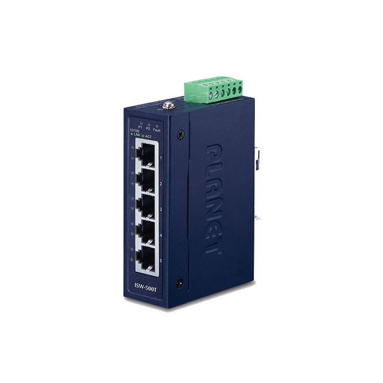 Ethernet switch, Planet IGS-500T Een ‘recht toe – recht aan’ switch voor je industriële omgeving. Compact in te bouwen 5-poorts 10/100/1000T Gigabit Ethernet Switch. Met redundante voeding van 9-48 VDC of 24V AC. Stevige behuizing voor wand- of DIN-rail montage. Lees hier meer.