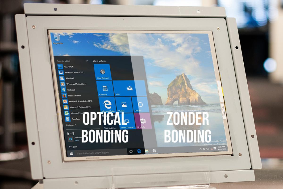 OPTICAL BONDING LCD Schermen zijn doorgaans gevoelig voor licht van externe bronnen die reflecties veroorzaken. Deze reflecties ontstaan doordat er een luchtlaag aanwezig is tussen het front en het LCD scherm. Het licht uit een externe lichtbron wordt door deze luchtlaag opgebroken en reflecteert via het LCD scherm terug naar de gebruiker. Dit werkt ook de andere kant op, het licht vanuit het LCD scherm wordt door diezelfde luchtlaag ook gebroken. Dit resulteert in een verminderde helderheid, contrastverlies en verslechterde kijkhoek. Optical bonding is een techniek die mede deze problemen oplost.