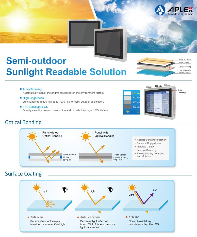 Lees meerHeeft u te maken met een scherm wat moeilijk afleesbaar is in zonlicht of ander omgevingslicht? Samen met APLEX Technology leveren we Panel PC's en TFT oplossingen met een optimale afleesbaarheid. Dit bereiken we door het toepassen van auto dimming en een high brightness LCD-panel waarbij de helderheid van het scherm automatisch wordt aangepast aan de omgevingslicht.